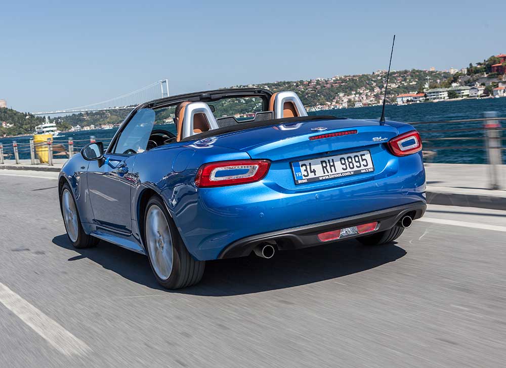 Altı ileri manuel şanzıman, MX-5’te olduğu gibi gücü arka tekerleklere iletiyor. 240 Nm torka sahip 1.4 litrelik turbo motor, 124 Spider’ı 0’dan 100 km/s hıza 7.4 saniyede çıkartabiliyor. Bu otomobilin asli görevi hızlanma ya da motor gücü değil. En büyük amacı eğlenceli bir sürüş sunuyor olması. 124 Spider kağıt üstünde güçlü gözüken fakat yolda o kadar da performans gösteremeyen bir motora sahip olsa da her virajda gaza ufak dokunsanız dahi arka tarafını bırakabilen bir otomobil. Yani performans tarafındaki eksiğini, eğlenceli sürüşü ile kapatmasını iyi biliyor. Özellikle ESP sistemini kapattığınızda her virajda drift yapıyormuş hissini size tattırıyor. Kontrol edilmesi kolay olan 124 Spider, net direksiyon sistemi ile komutlarınıza iyi bir şekilde karşılık veriyor. 1050 kilogramlık 124 Spider, hafifliği sayesinde tutumlu olmayı da başarıyor. 1.4 litrelik turbo motor sakin kullanımda ortalama 6.4 lt/100 km’lik bir tüketim değerine sahip. Tentesi manuel olarak kaldırılan otomobil, yolda bütün gözleri üzerine çekebilecek bir tasarıma sahip.