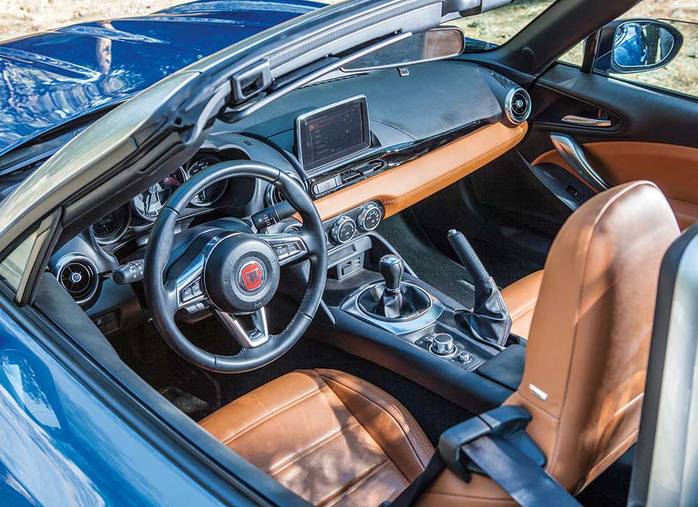 124 Spider, Mazda MX-5’e nazaran daha keskin hatlara sahip. Bu sebeple daha sportif duruyor. İç mekân direksiyon simidinin üstündeki Fiat logosu hariç MX-5 ile birebir aynı. İki kişilik 124 Spider’da bir bardaklık bile bulunmuyor oluşu can sıkıcı olabiliyor. Sert süspansiyon, bel,sırt ve boyun ağrısı olanlar için sıkıntı yarabilecek kadar sarsıntı iletiyor kabine. Bu sarsıntılar daha 10 bin km’ye bile gelmemiş test aracımızın içerisinden tıkırtılar gelmesine sebep olmuş. Test aracımız, 124 Spider’ın en yüksek donanım seviyesine sahipti. Zengin bir donanım listesine sahip 124 Spider, Gusto paket ile birlikte dokuz hoparlörlü Bose ses sistemini de sunuyor. Oldukça iyi ses kalitesine sahip bu sistem, aracın üstü açıkken de kaliteli sesiyle dikkatleri üzerine çekiyor. Yine Gusto paket ile full LED ön farları da standart olarak sunuyor. Deri koltuklar, 7.0 inçlik dokunmatik multimedya sistemi, 17 inç alaşım jantlar ve otomatik klima da yine üst donanımda standart olarak sunulan diğer özellikler.