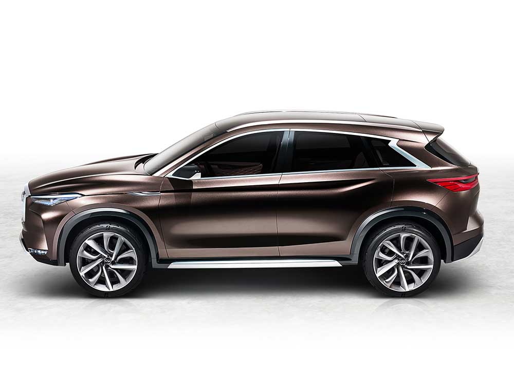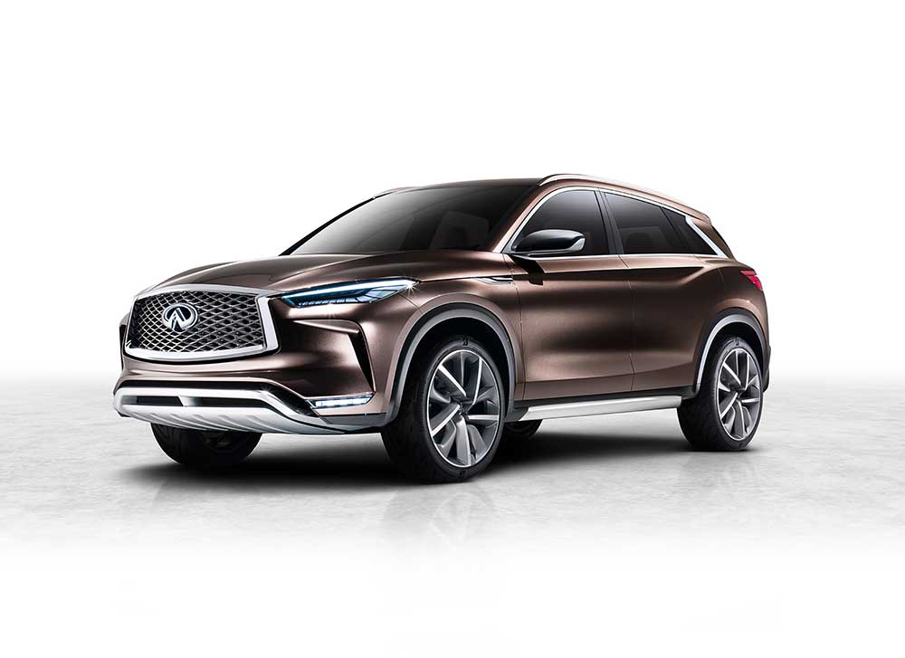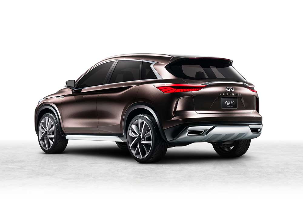 Detroit Otomobil Fuarı olarak da bilinen Kuzey Amerika Uluslararası Otomobil Fuarı’nda sergilenen QX50 Concept ile orta boy SUV segmentinde yer alacak aracını gün ışığına çıkaran Infiniti, 2017 yılında bu aracı seri üretime dahil ediyor. 2016 yılında Beijing (Pekin) Otomobil Fuarı’nda ilk olarak gösterilen ve Avrupa prömiyeri ise Paris Otomobil Fuarı’nda yapılan Infiniti QX Sport Inspiration’ın devamı niteliğindeki QX50 Concept, markanın yeni “güçlü zarafet” tasarım anlayışını yansıtıyor. Infiniti’nin karakteristik radyatör ızgarası görkemli bir ifade sağlarken yüksek motor kaputunun dinamik yapısı tüm aracı çevreleyerek arkaya doğru uzanıyor. Infiniti’nin imzası niteliğindeki “yeni ay kesimli” C sütunları ve “insan bakışlı” farları QX50 Concept’te de varlığını sürdürüyor. Olabildiğince öne doğru yerleşimli kabin tasarımı (cab-forward) sayesinde geniş bir iç mekân sunan QX50 Concept, “sürücü odaklı-yolcuları düşünen” iç mekân felsefesiyle tüm konuklarının ihtiyaçlarını eşit şekilde karşılıyor. Fonksiyonllikten ödün vermeden akışkan yüzeyler eşliğinde tamamlanan iç mekanda premium malzemeler yüksek mühendislikle birleştiriliyor.