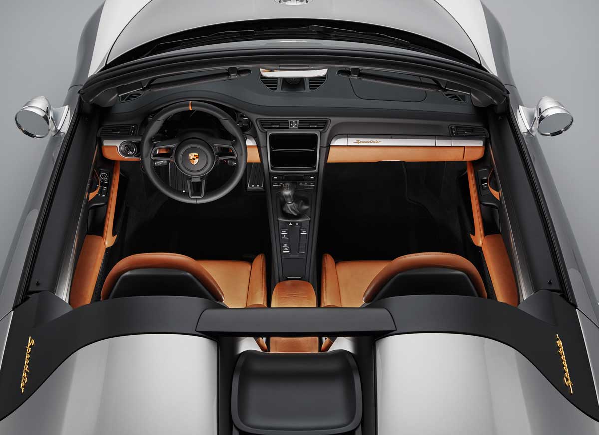Seri üretimle ilgili karar ise önümüzdeki aylarda verilecek. 911 Speedster Concept modelinin sahip olduğu özellikler arasında daha kısa çerçeve uzunluğuna sahip, daha eğimli bir ön cam ve buna paralel olarak küçültülmüş yan camlar yer alıyor. Otomobil, sahip olduğu alçak flyline ile atalarından olan Porsche 356 1500 Speedster gibi modellerde görmeye alışık olduğumuz o toplu görünüme bürünüyor. 1988 model 911 Speedster’dan bu yana gelenekselleşmiş bir tasarım çizgisi olan “çift bombe” tasarımına sahip ve karbon fiberden yapılmış olan özel arka kapak, devrilme koruma yapısını kaplıyor ve ön koltukların arkasında birleşiyor. ‘Bombelerin’ arasında yer alan kontrast siyah renkteki hava kanatçıkları otomobile aerodinamik bir dokunuş katarken şeffaf Plexiglas rüzgâr önleyiciye işlenmiş olan ‘Porsche 70 yaşında’ logosu ise markanın geçmişini ön plana çıkarıyor. Tarihe adını yazdırmış olan modelin orijinalinde olduğu gibi 911 Speedster Concept’te de açılır tavan yerine hafif bir otomobil tentesi bulunuyor. Sekiz adet Tenax çıtçıtı ile tutturulan tente, otomobil park halindeyken iç mekânı yağmurdan koruyor. Speedster felsefesinin hafiflik ilkesi iç mekânda da kendini gösteriyor; otomobilde navigasyon, radyo ve klima sistemi bulunmuyor. Karbon fiberden yapılmış olan yarış koltukları ve Cognac 356’da bulunan açık kahverengi Aniline deri kaplaması otomobilin artık bir klasik olan atalarına gönderme yapıyor.