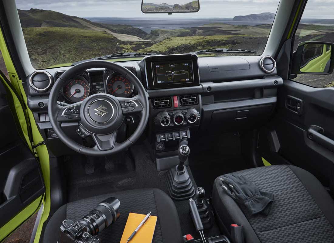 Birçok yeni nesil otomobilin aksine farklı renklerdeki süslemelerden arındırılmış siyah renkli sade kokpit tasarımı, sürücünün dikkatini dağıtmadan tamamen sürüşe odaklanmasını sağlıyor. Yatay çizgiler geniş bir görsel izlenimi beraberinde getirirken, dikey çizgiler gösterge paneli ile orta konsolun sınırlarını belirliyor ve sürücünün kullanım ergonomisine katkı sağlıyor. Zorlu off-road koşullarında el yordamıyla ulaşılan ve ele iyi oturan kumanda elemanları kadar temizlemesi kolay ve çizilmeye karşı dayanıklı malzemelerle bezenen kokpitteki her bir detay profesyonel kullanım ergonomisini dışa vuruyor. Derinlemesine gömülmüş kare çerçeveli göstergeler güneş parlaması da dâhil olmak üzere her türlü sürüş koşulunda rahatlıkla okunabiliyor. Bluetooth uyumlu akıllı telefon desteğine sahip dokunmatik ekranlı ses ve görüntü sistemi ise yolculukları keyfe dönüştürüyor. Yerini aldığı selefine oranla 53 litre artan bagaj kapasitesi yeni Jimny’de 377 litreye ulaşıyor. Katlanan arka koltuklar, geniş bagaj ağzı, bagajın yan duvarları ve koltuk tasarımının optimizasyonu sayesinde son derece kullanışlı, düz ve geniş bir yükleme alanı kullanıma sunuluyor. Temizlemesi kolay plastik ile kaplanan arka koltuk sırtlıkları ve bagajın yan duvarları sayesinde kullanım fonksiyonelliği destekleniyor. İyi bir off-road aracının en zorlu koşullarla dahi başa çıkabilmesi gerekiyor. Kompakt boyutların getirisi olan hafif gövde ve 1.5 litre hacimli yüksek verimlilik seviyesine sahip motoruyla yeni Suzuki Jimny en zorlu maceralar dahil her türlü kullanım şartında etkileyici bir performans sunarken; yüksek rijitlik seviyesine sahip gövde ve yol titreşimlerini sürücüye iletmeyen, yenilikçi bağlantılarla donatılan direksiyon sistemi sürüş konforunu destekliyor.