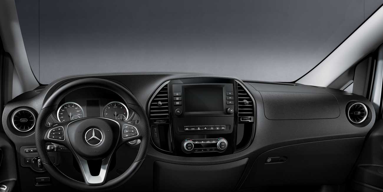 Yeni Vito Tourer’ın iç mekânı da güncellenmiş. Daha önce kullanılan “Tunja” kumaş yerini esnek bir yapı ve şık bir görünüm sunan “Caluma” kumaşa bırakıyor. Ön konsolun sol ve sağ ucunda sportif bir görünümü beraberinde getiren yeni türbin görünümlü havalandırma ızgaraları devreye giriyor. Vito Tourer, Vito Mixto ve Vito Kombi modellerinde standart olan ve krom paket kapsamında sunulan parlak piyano siyahı orta konsol ile kalite algısını daha da yükseltiyor. Söz konusu donanım ile birlikte havalandırma ızgaralarının çevresinde de krom uygulanıyor.